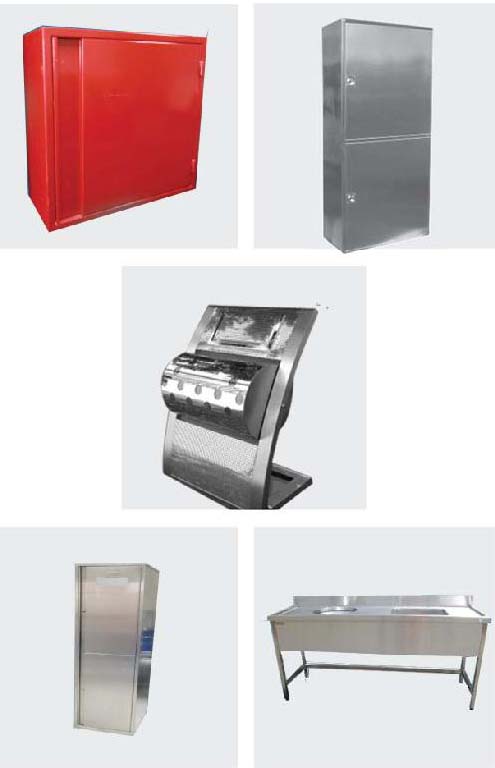 Covers a wide range of products like stainless steel decorative air conditioning grills, light decors, column cladding, lockers, trolleys and carts, storage trolleys, industrial platforms with safety guard rails, water features, corner guards, clinical tables.